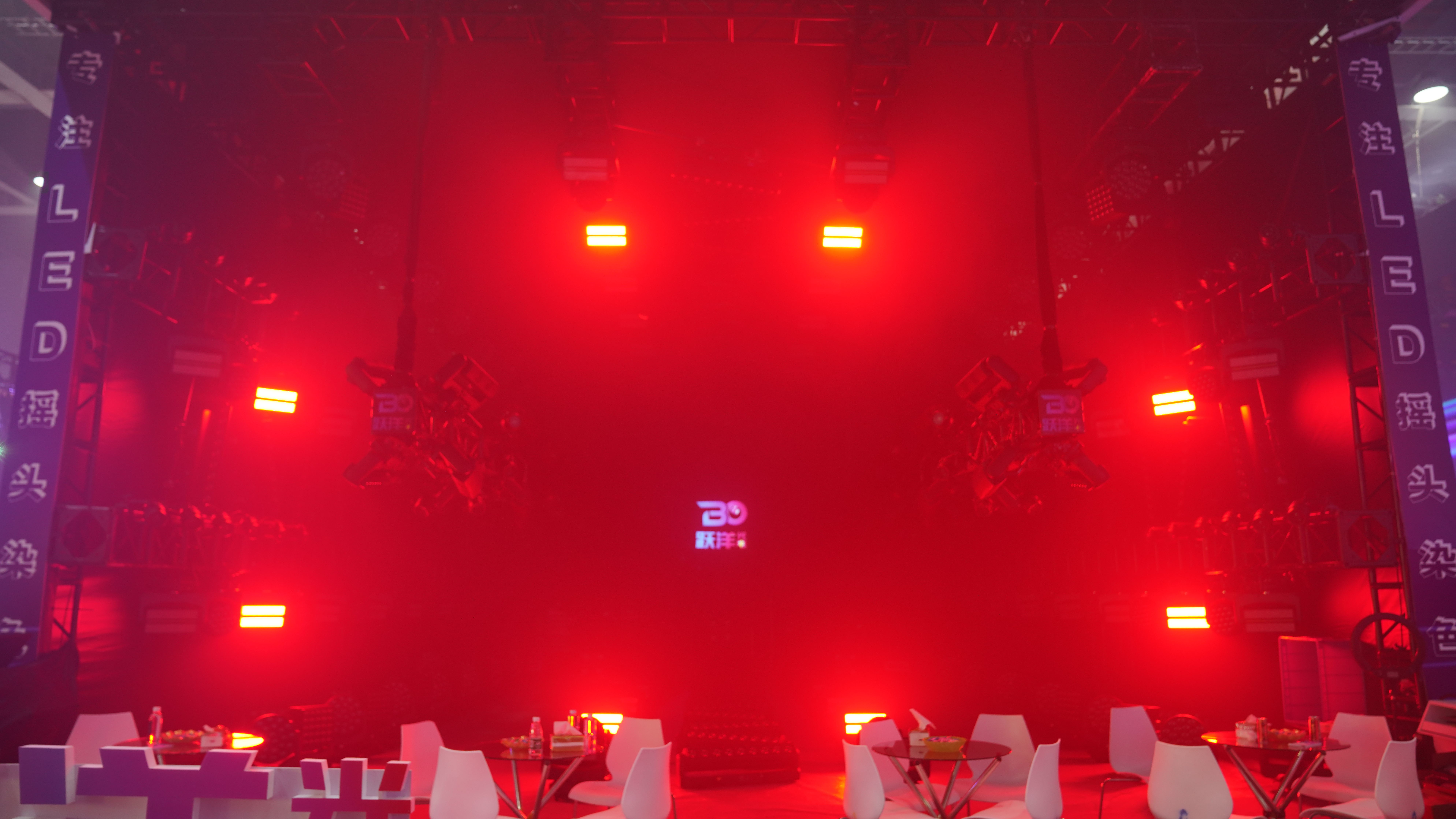 Two side set two hang truss, installed with 6x60W Led beam wash moving head and 8x60W waterproof zoom par light.They are very eye-catching, many visitors are mistook there are beam moving head. The 9x60W bar zoom moving light set as background light and put a row on floor,create a beam curtain.